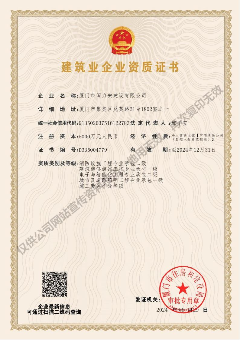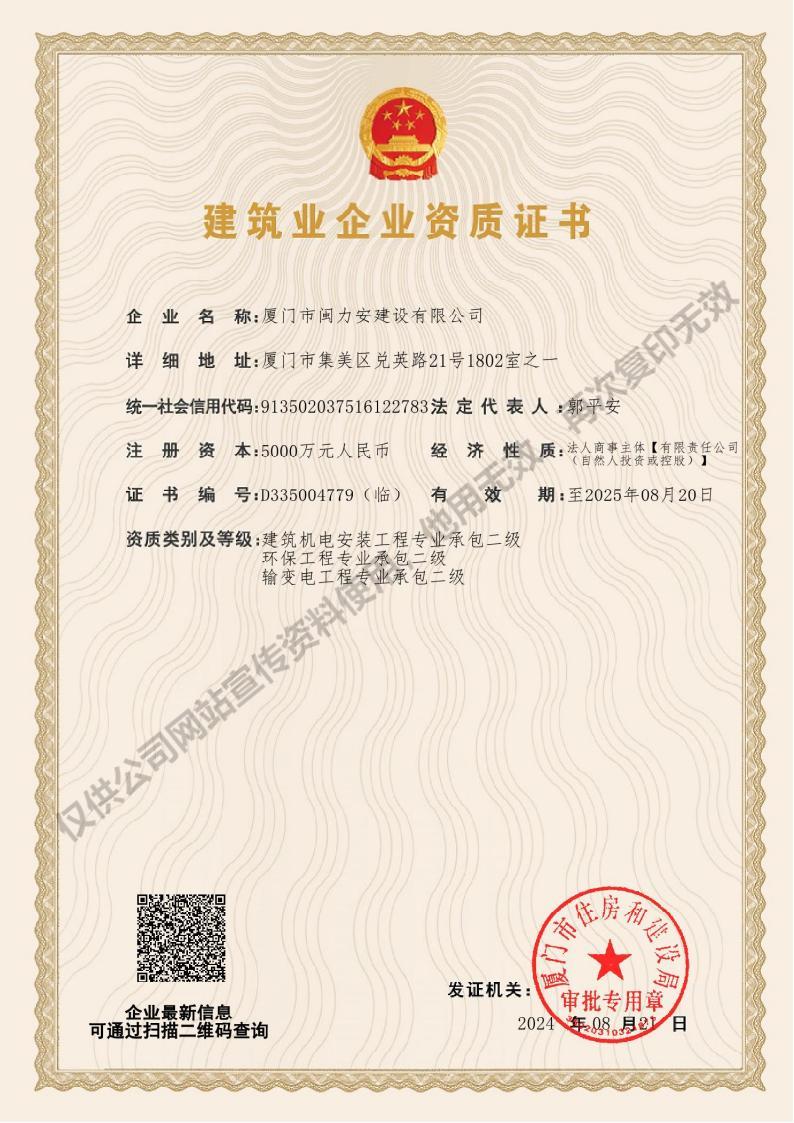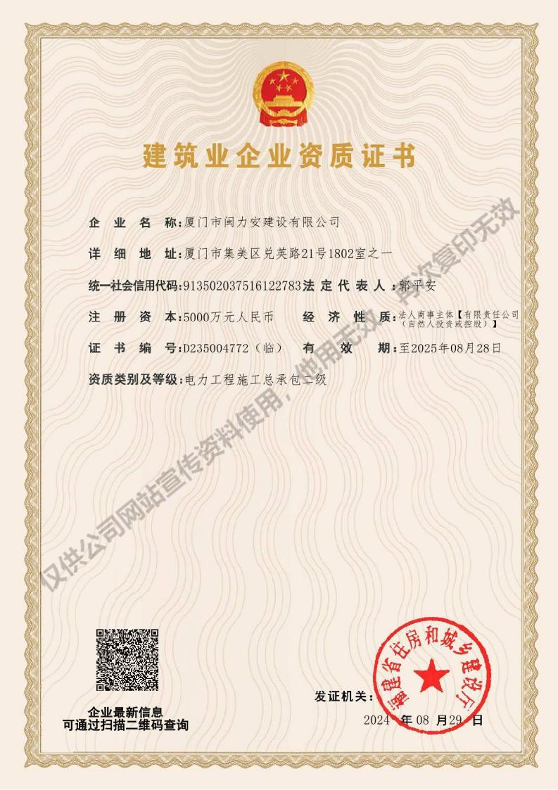 祝賀閩力安取得:建筑業(yè)企業(yè)各種資質(zhì)證書發(fā)布日期:2024-08-15 瀏覽次數(shù):2580